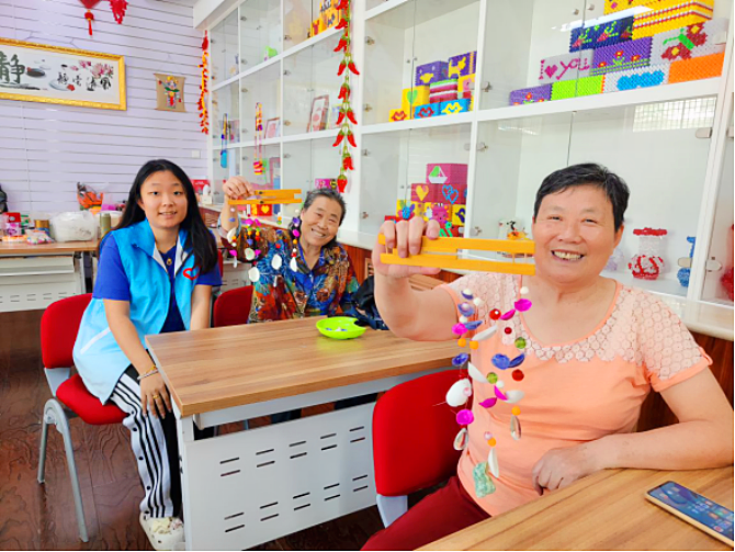 “风铃可以发出悦耳的声音,给人带来平静和放松的感觉。将贝壳和风铃结合在一起,表达了对自然之美、宁静和舒适的向往。”活动中,志愿者向居民介绍风铃的起源文化和制作方法。随后,志愿者为大家分发制作风铃的材料和工具,包括细绳、贝壳片等。居民们坐在一起,在欢声笑语中开始制作贝壳风铃,大家小心翼翼地将贝壳穿过细线,用心地排列着贝壳的顺序,时而调整位置,时而添加新的贝壳,很快地,一个个独特又靓丽的贝壳风铃就制作好了。居民们拿起制作好的风铃,来回摆动,风铃叮叮作响,仿佛耳边轻奏起大海的乐章。