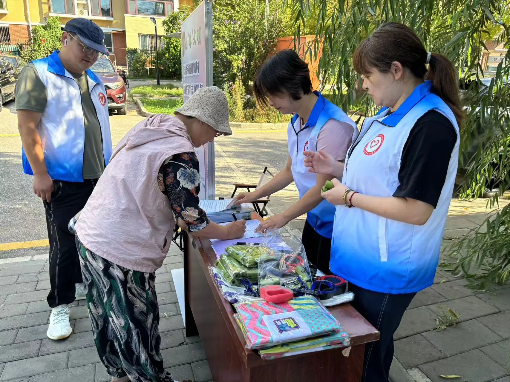 在枯柳树村,实践站工作人员和志愿者为村民们发放文明养犬倡议书、狗绳等养犬用品,并让大家意识到犬吠扰民、犬只伤人、不拴犬链、犬只随地大小便等问题对社区生活造成的不利影响,同时向大家强调携犬外出时要拴绳,遇到老人、小孩、孕妇要自觉避让,宠物犬在道路和其他公共场所产生的粪便应及时清理,倡导村民们共同营造文明养犬的村居氛围。