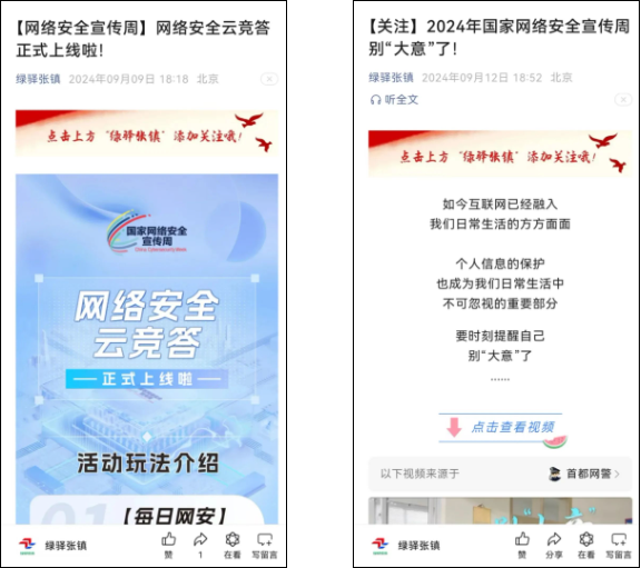 活动通过各村居宣传栏、LED电子屏、播放科普视频等方式深入宣传网络安全知识,并在“绿驿张镇”公众号持续发布“网络安全宣传周”相关内容,营造“人人参与,人人有责,人人共享”的网络安全宣传氛围,并实现镇域全覆盖。
