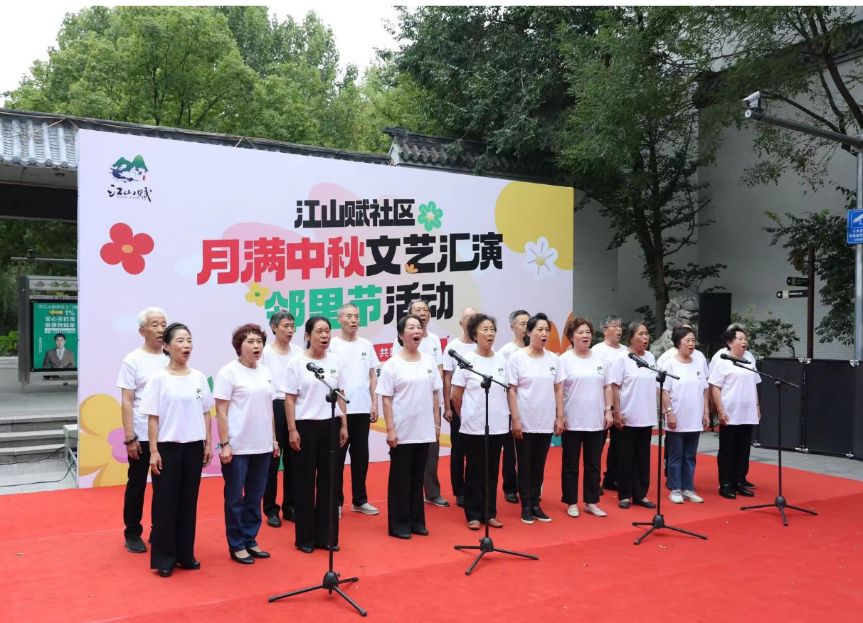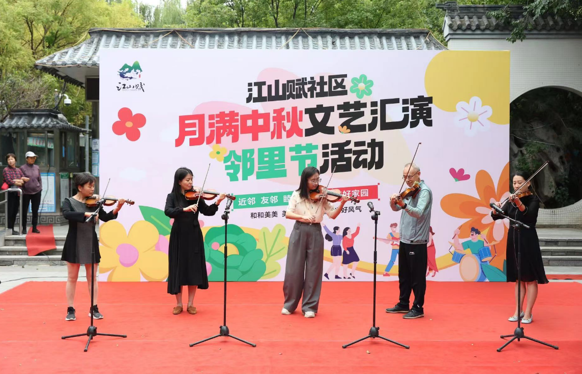 在江山赋社区实践站举办的“近邻友邻睦邻,共建美好家园”月满中秋文艺汇演邻里节活动中,社区文艺爱好者纷纷展现自己的风采,时装走秀、太极表演、合唱、诗朗诵、小提琴表演等一个个精彩节目轮番上演,为居民们奉上了一场中秋文化盛宴,让大家在热闹喜庆的氛围中共度中秋佳节。