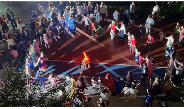 为庆祝祖国75周年华诞,云赋家园社区实践站开展了“一路锦绣一路歌,篝火燃情庆华诞”主题活动。在篝火晚会上,身穿各民族服饰的社区居民和小朋友们欢聚一堂,伴随着一曲体现蒙古族充满气势和热血的开场舞,篝火晚会活动拉开了序幕,紧接着,新疆维吾尔族《铃铛舞》、藏族舞蹈《香格里拉》、纳西族歌曲《纳西情歌》、傣族舞《雨竹林》一个个精彩节目让观众享受了一场极具民族特色的视听盛宴,现场喝彩声和欢笑声此起彼伏,居民们共同体验了多种民族文化,增强了家国情怀和维护民族团结的责任意识。