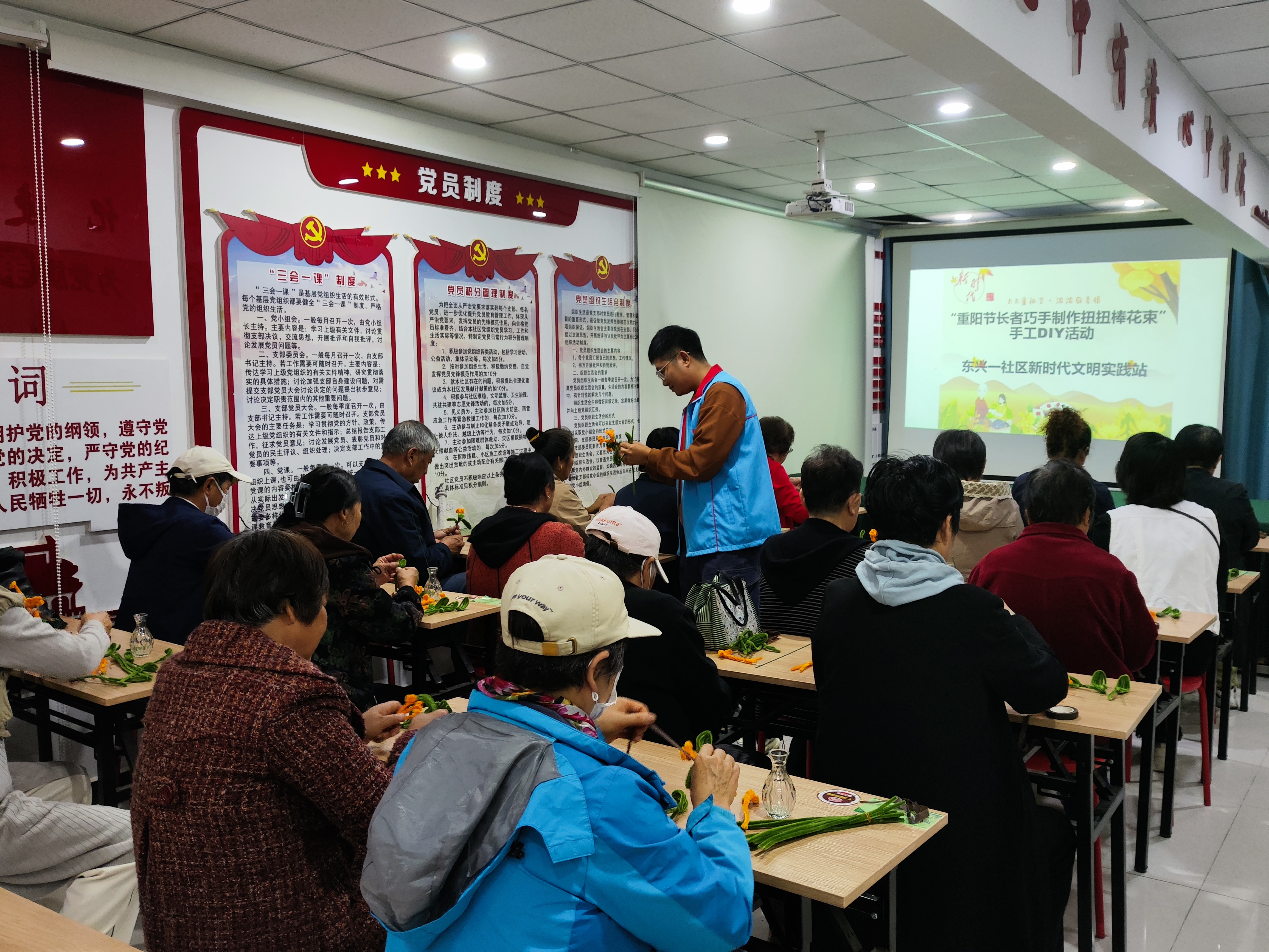 光明街道东兴一区新时代文明实践站开展“巧手制作扭扭棒花束”重阳节主题活动