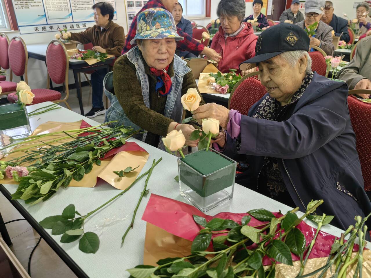 活动中,花艺老师向居民们细致讲解花艺的起源文化和插花技巧,并强调色彩搭配在插花艺术中的重要性。随后,居民们纷纷开始选花、剪枝、搭配,大家在花香中一边交流,一边创作,现场气氛其乐融融,社区王阿姨说:“在重阳节这个特殊的日子里,是我第一次插花,能和这么多人一起学习插花,相互学习,并能获得一门新手艺,我非常开心,感谢社区对我们的关心。”