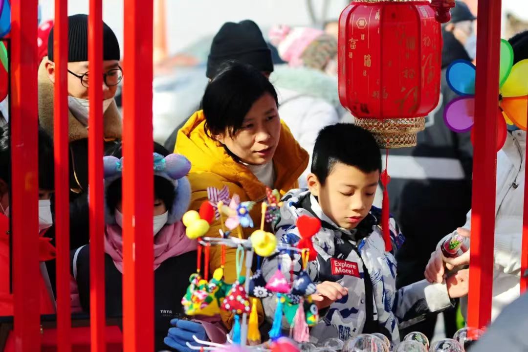 活动现场除了精彩的舞龙表演,还有庙会活动,在民间艺术摊位上,非遗传承者制作毛猴、风车、糖画、糖葫芦,押花葫芦、绘制京剧脸谱、摇元宵等,都让百姓大饱眼福。此外。猜灯谜、套圈互动游戏吸引了众多年轻父母和孩子们驻足游玩。