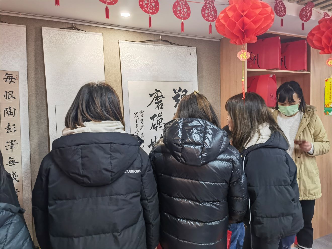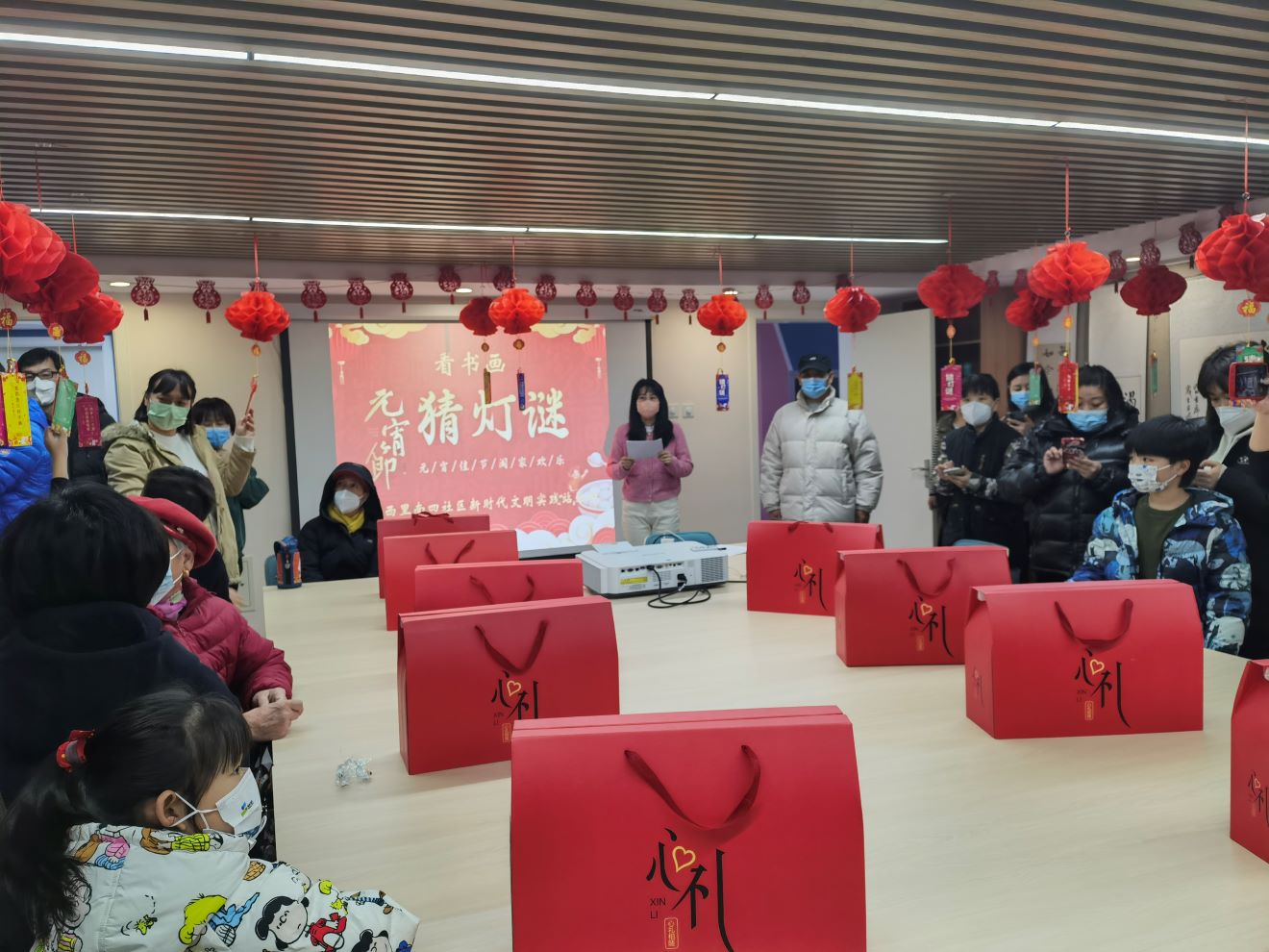 志愿者们早早布置好了书画室,红彤彤的大红灯笼下悬挂着五颜六色的灯谜,好一片喜气洋洋的景象。活动设置了成语类、植物类,电影名类、字谜类、名人类、脑筋急转弯等一百条灯谜。居民们一边欣赏书画室的名师佳作,一边猜灯谜,感受中国传统文化的氛围。