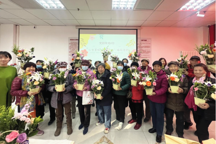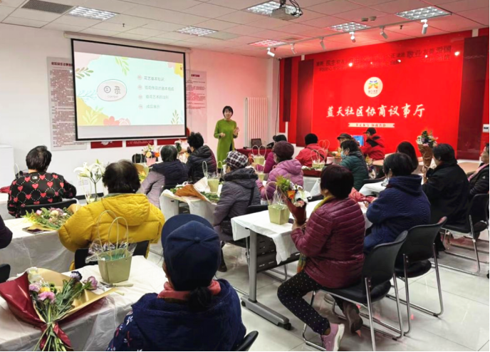 蓝天社区实践站开展了“心生美好,如花绽放”插花活动。活动现场,花香四溢,气氛热烈而温馨。老师向大家介绍插花艺术的基础知识,包括花材的种类、色彩搭配原则、构图技巧等,让居民们对插花这门艺术产生了浓厚兴趣。在操作环节,居民们在杜老师的耐心指导下,充分发挥自己的创造力和想象力,将百合、玫瑰、紫罗兰、小雏菊等各种花材巧妙搭配,经过精心修剪枝叶、调整位置,一个个充满生机又靓丽的插花作品逐渐呈型。