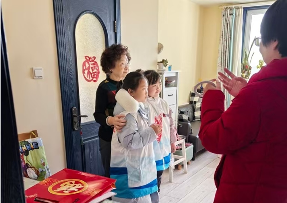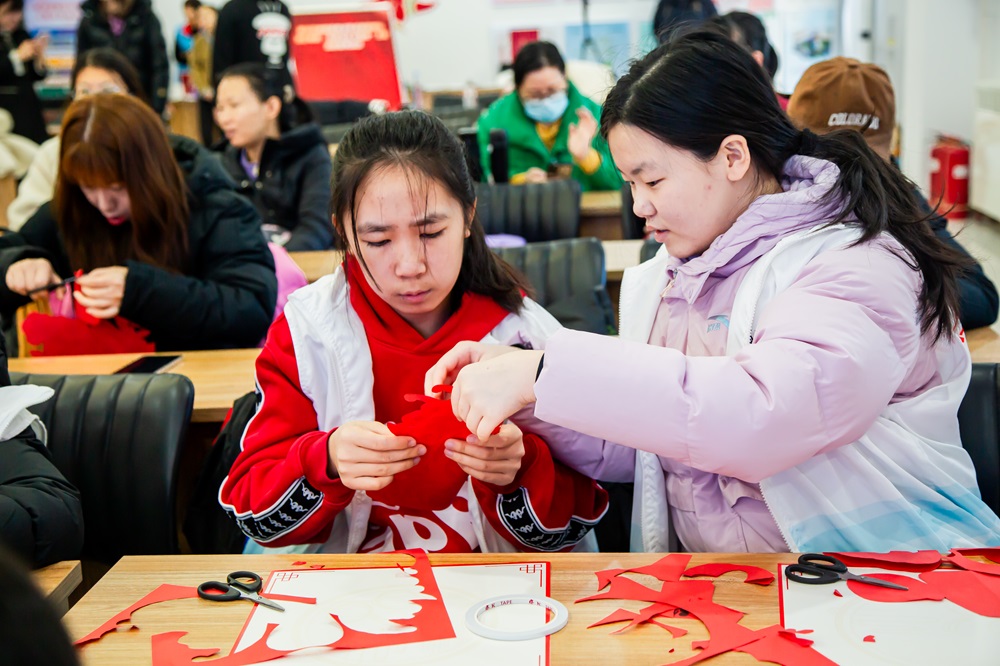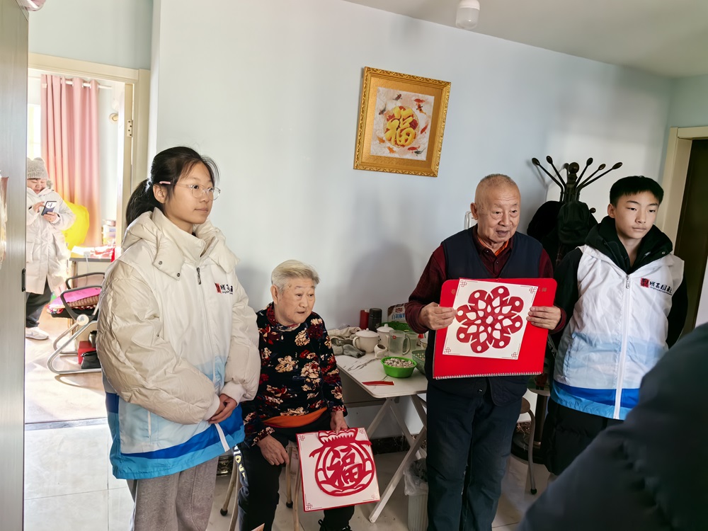 培训结束后,志愿者们迎来了此次寒假志愿系列活动的第一项活动——“传承非遗技艺,巧手剪纸送祝福”主题活动。手工老师通过PPT生动形象地为志愿者们讲解中国剪纸的历史、派系和用途,并手把手讲授剪纸技巧。孩子们认真学习着剪纸,在一折一剪之间,创作出一幅幅精美的剪纸作品。这些作品不仅为启动仪式增添了浓厚的节日氛围,也让大家感受到传统文化的独特魅力。在现场活动结束后,实践站陆续安排“鼎呱呱”的志愿者们与社区工作人员一同上门送福,为高龄孤寡老人们送上亲手制作的窗花剪纸与节日的问候。