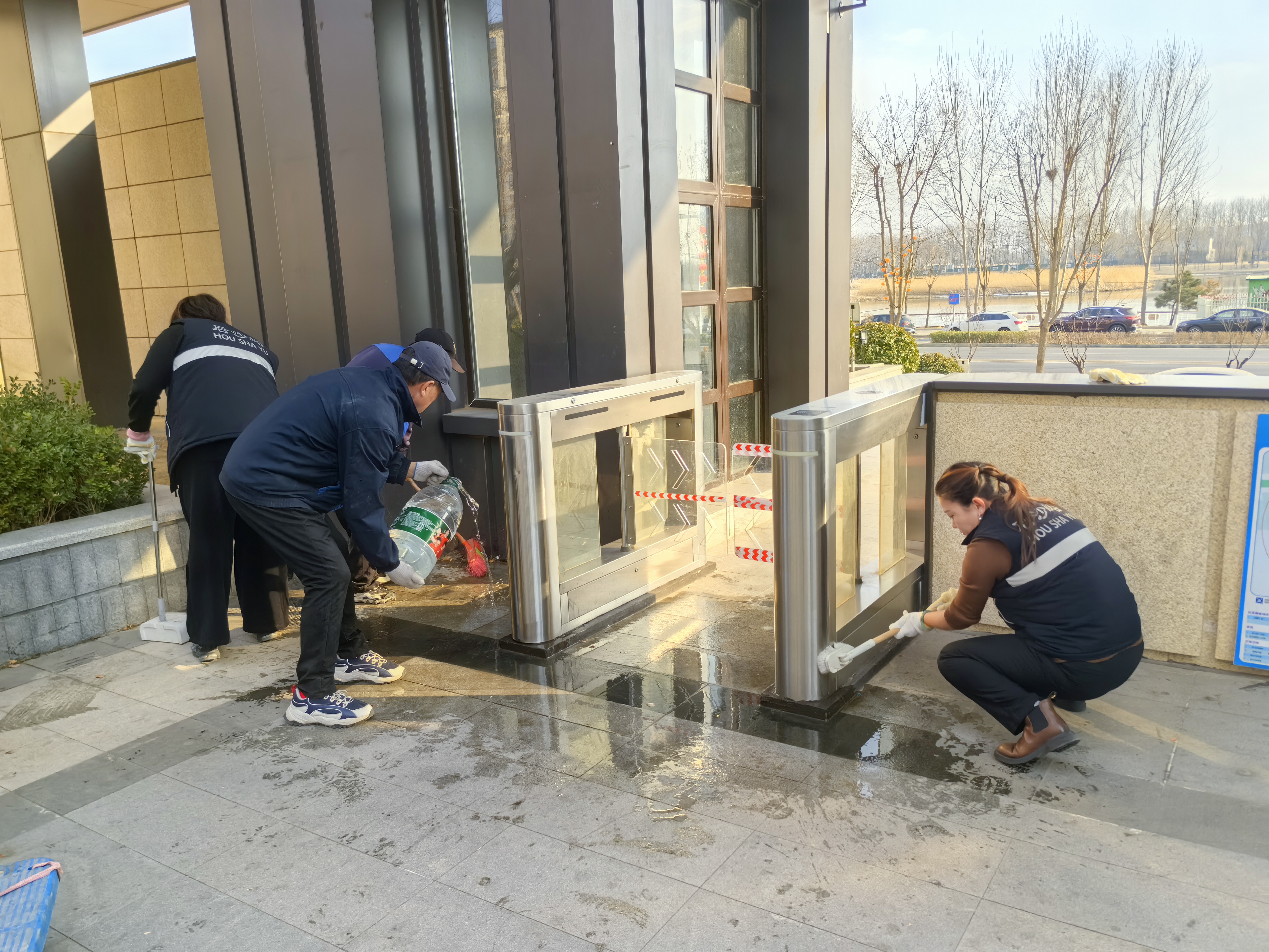 蓝境佳园社区实践站组织社区年轻党员和志愿者开展环境卫生清洁活动,重点对小区门口以及单元门附近的狗尿污渍进行清理,以实际行动践行党员的责任与担当。党员志愿者们不怕脏、不怕累,仔细地对每一处狗尿污渍进行清洁。经过大家的努力,原本污渍斑斑的地面逐渐恢复了干净整洁。
