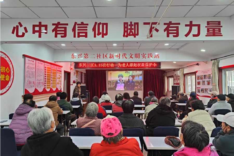 光明街道东兴二区新时代文明实践站开展“3·15在行动——为老年人撑起权益保护伞”宣讲活动