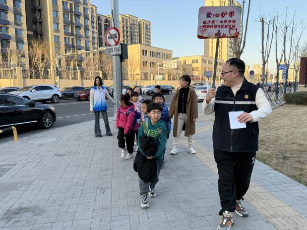 在顺颐名苑社区,由党员志愿者、平安志愿者和家长志愿者组成的“爱心护学”小组,每日傍晚在后沙峪二小开展“爱心小路队”行动。志愿者们手持文明交通引导牌,引导学生们有序返回社区。