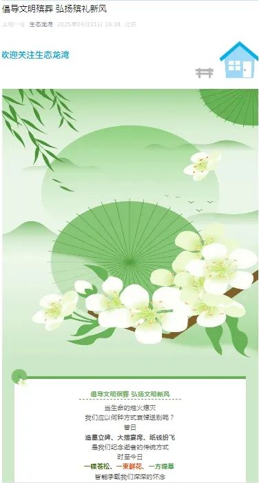 清明节期间,镇新时代文明实践所(站)通过播放广播、张贴宣传标语、发放文明祭扫倡议书等形式开展文明祭扫宣传实践活动,鼓励群众通过鲜花祭祀、植树祭祀、线上云祭扫等绿色方式寄托哀思。同时,在“生态龙湾”微信公众号发布《倡导文明殡葬 弘扬殡礼新风》,大力倡导文明祭扫,树立文明、节俭、环保、绿色祭祀理念。