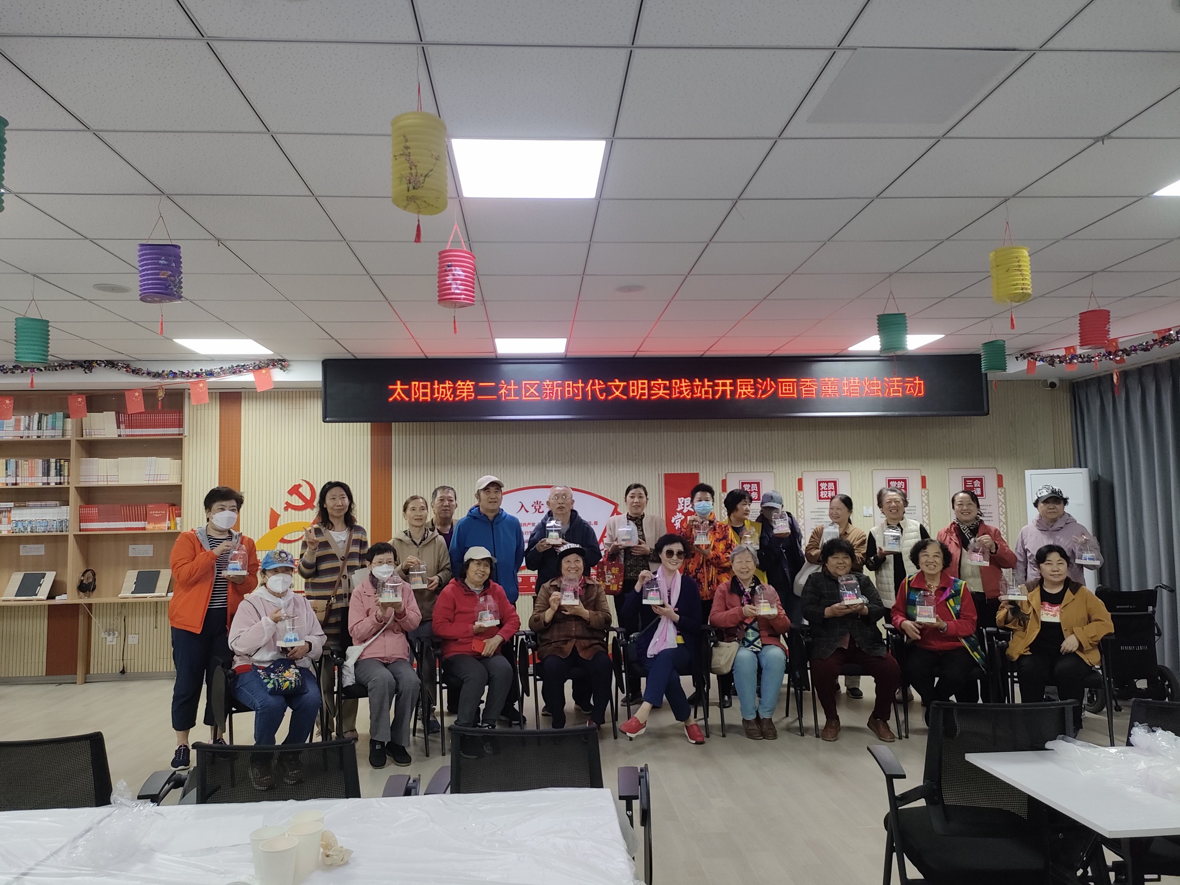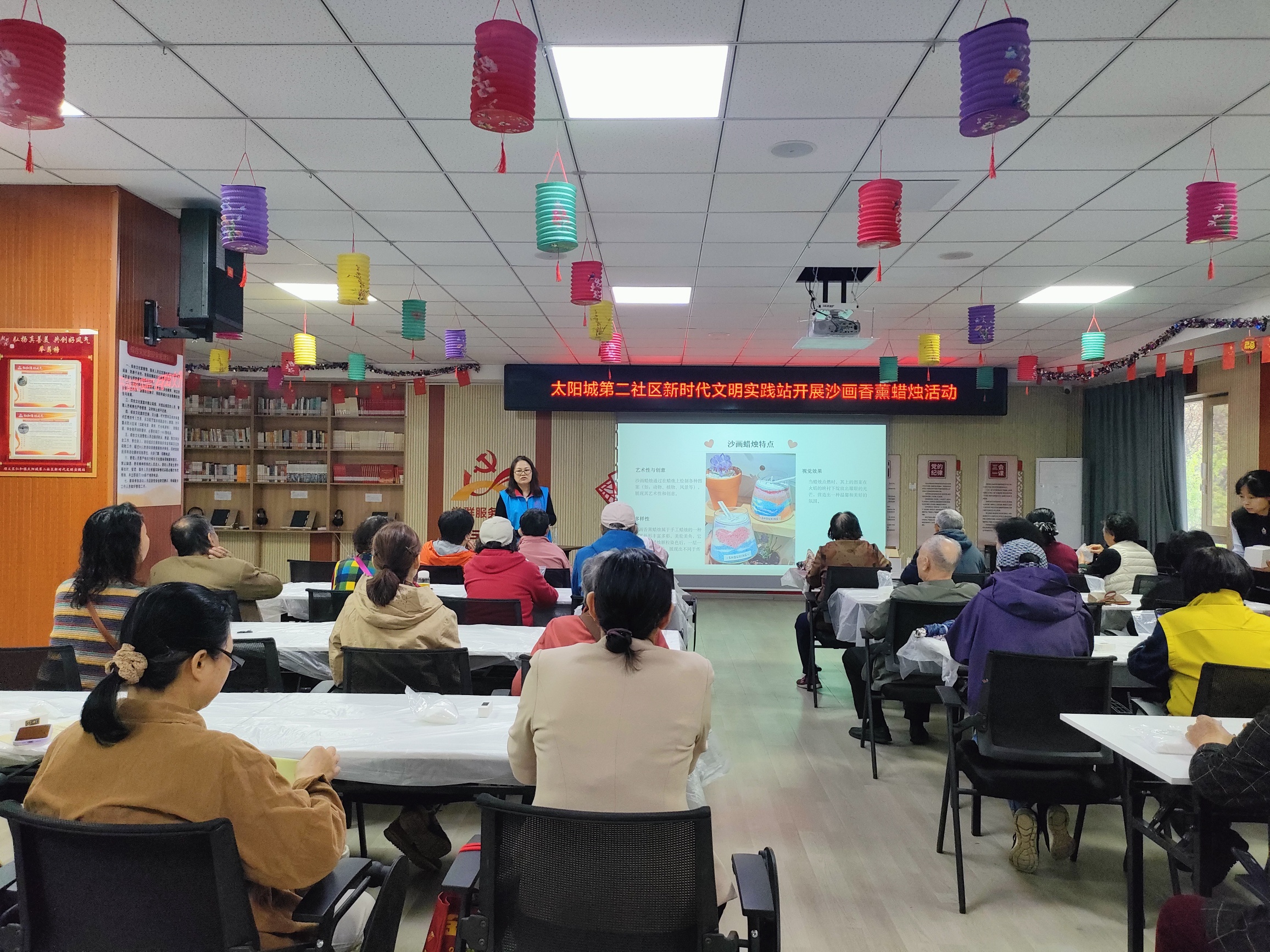 为丰富社区居民的精神文化生活,增进邻里交流,近日,太阳城第二社区新时代文明实践站开展了沙画香薰蜡烛手作活动,吸引了20余位居民热情参与。