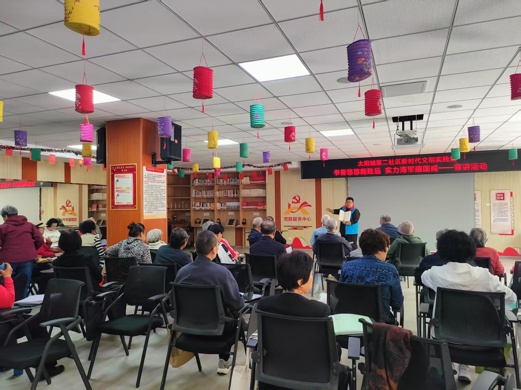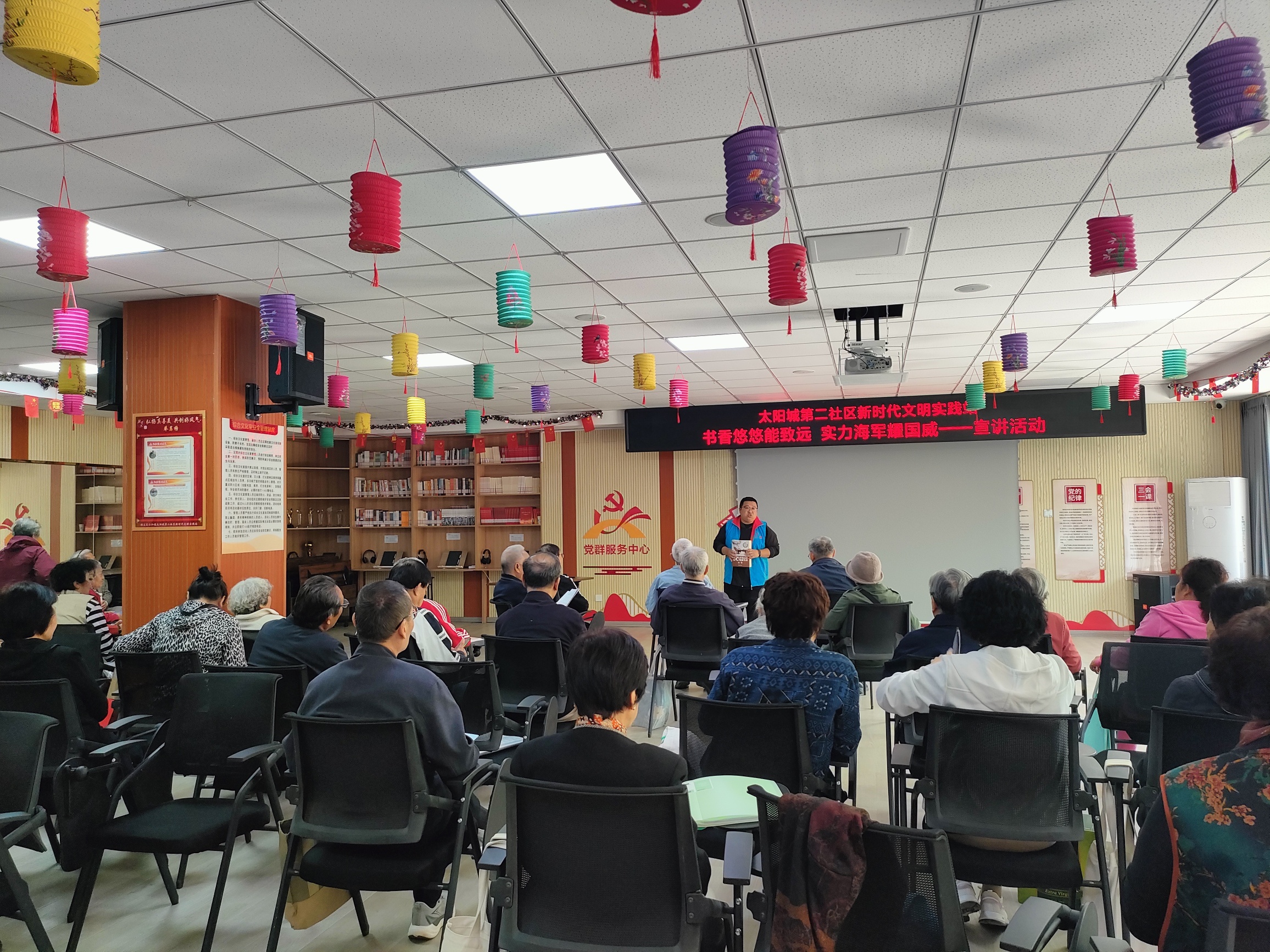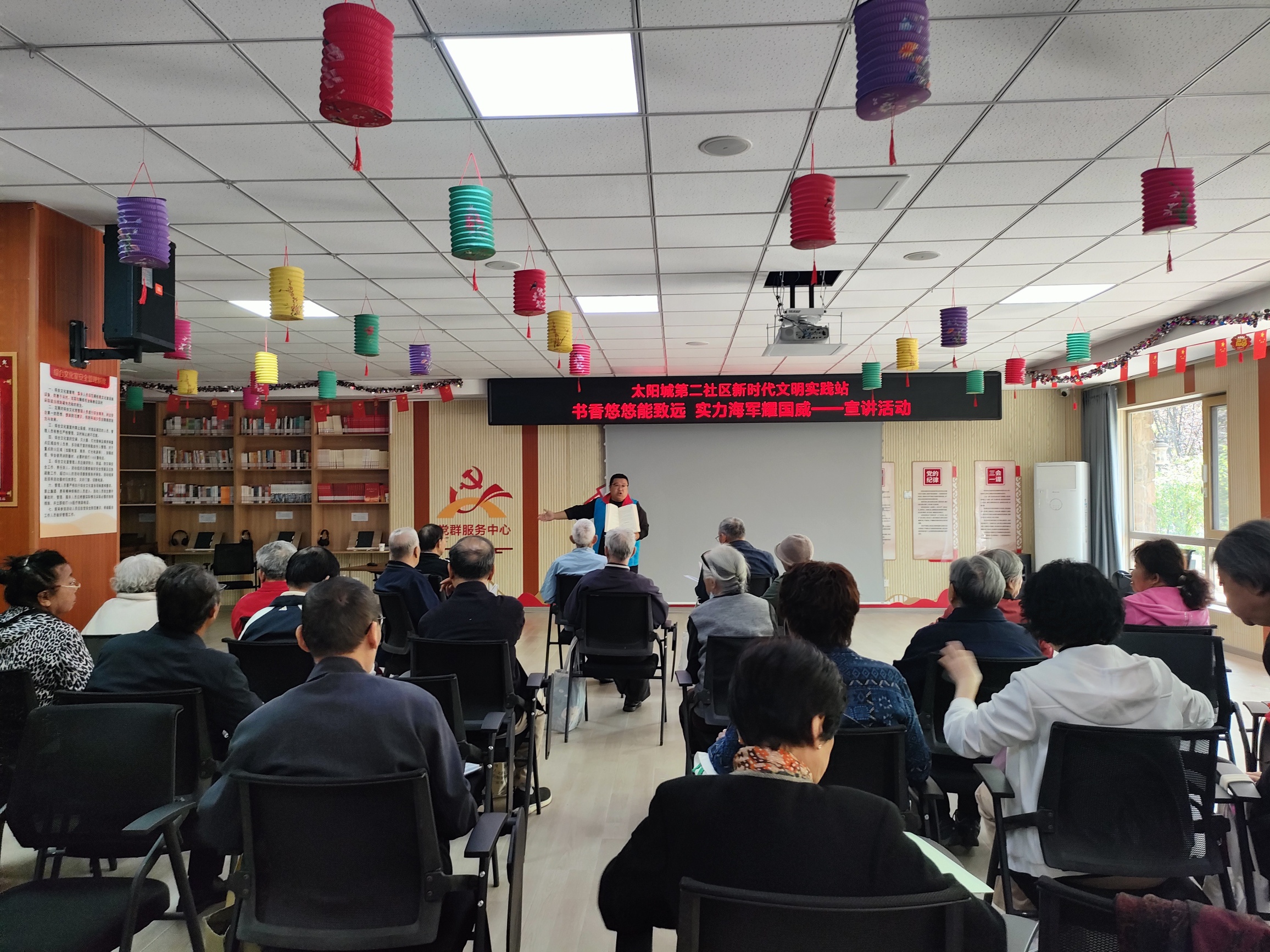 活动中,志愿者为大家介绍我国海军的发展历程与辉煌成就,激发居民的爱国情怀与民族自豪感。随后,志愿者为大家介绍实践站读书角,并分享阅读书籍的感悟与收获,倡导大家选择并阅读自己喜欢的书籍,引导居民多读书、读好书。