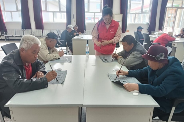 活动中,志愿者详细讲解毛笔的种类及结构、执笔的方法与握姿等知识,带村民朋友一起临摹,掌握基本的书法技巧,同时陶冶情操。