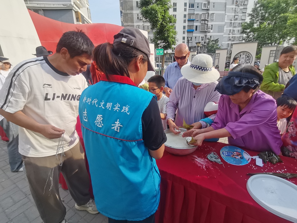 汇演结束后,端午节主题包粽子环节热闹开启。社区提前备齐糯米、粽叶等食材,居民们围在一起,捋粽叶、填糯米、封口、扎捆,转眼间一个个清新雅致的粽子迅速成型。