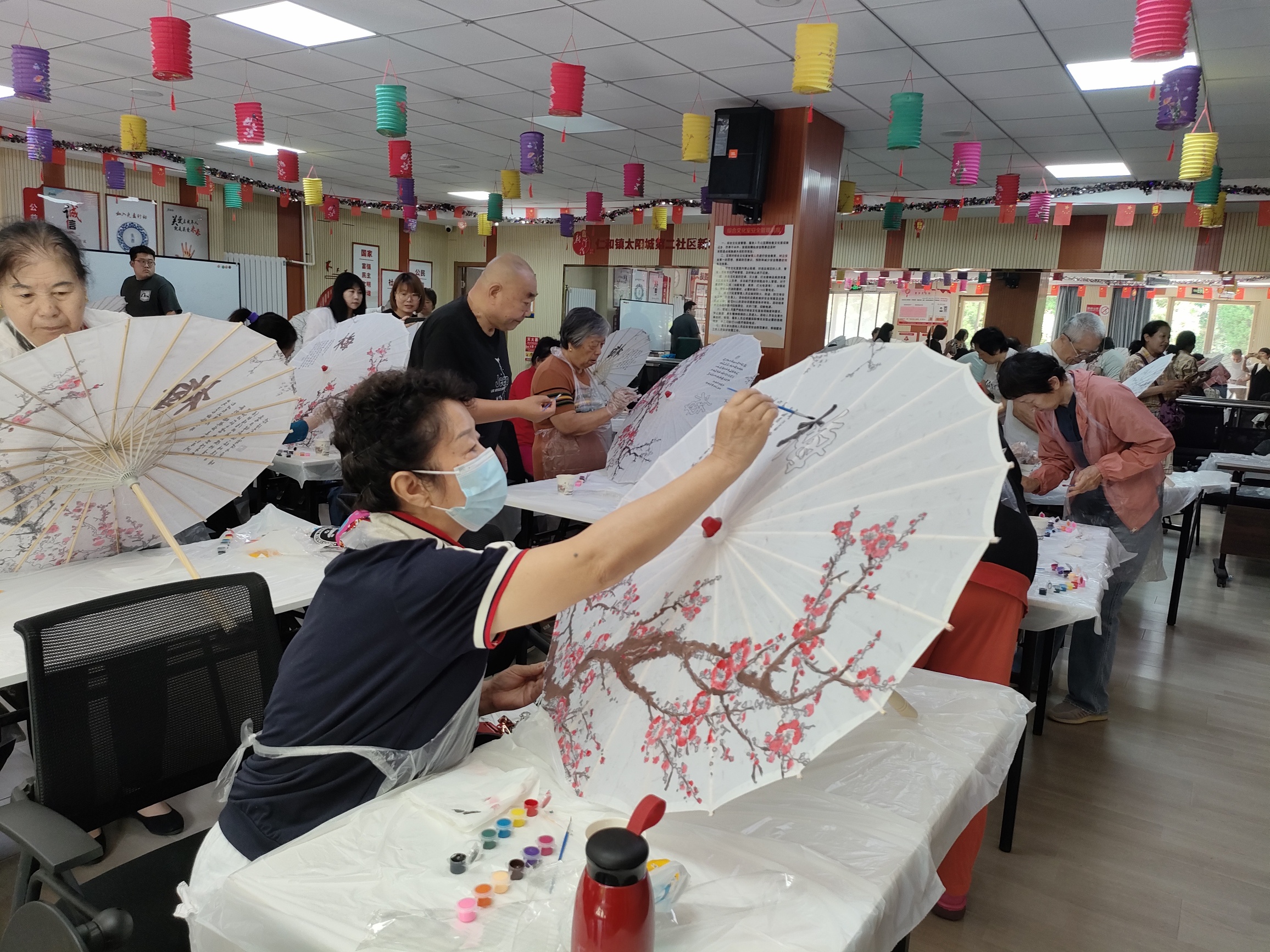 活动中,老师为大家介绍油纸伞的起源文化和制作工艺,并带居民们一起制作油纸伞。居民们在油纸伞上尽情创作,用彩绘让传统油纸伞换发新的活力。经过一个多小时的精心创作,一把把充满韵味又雅致端庄的油纸伞就制作好了。