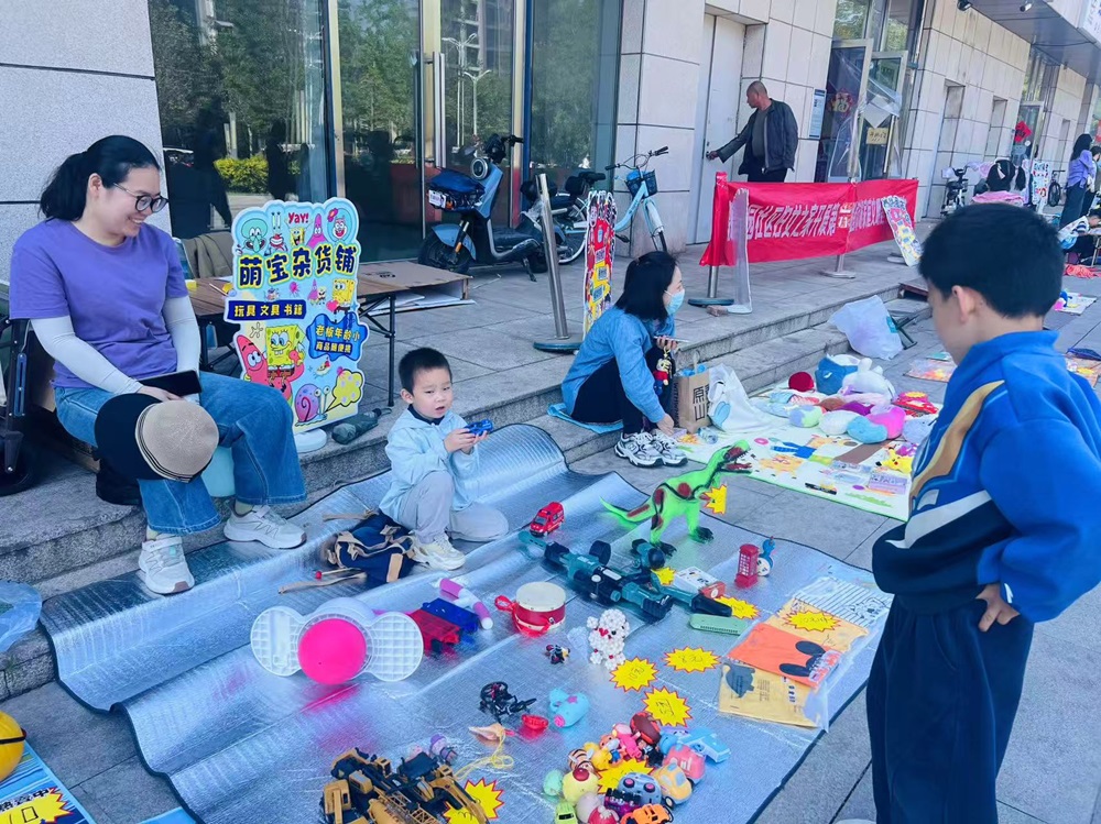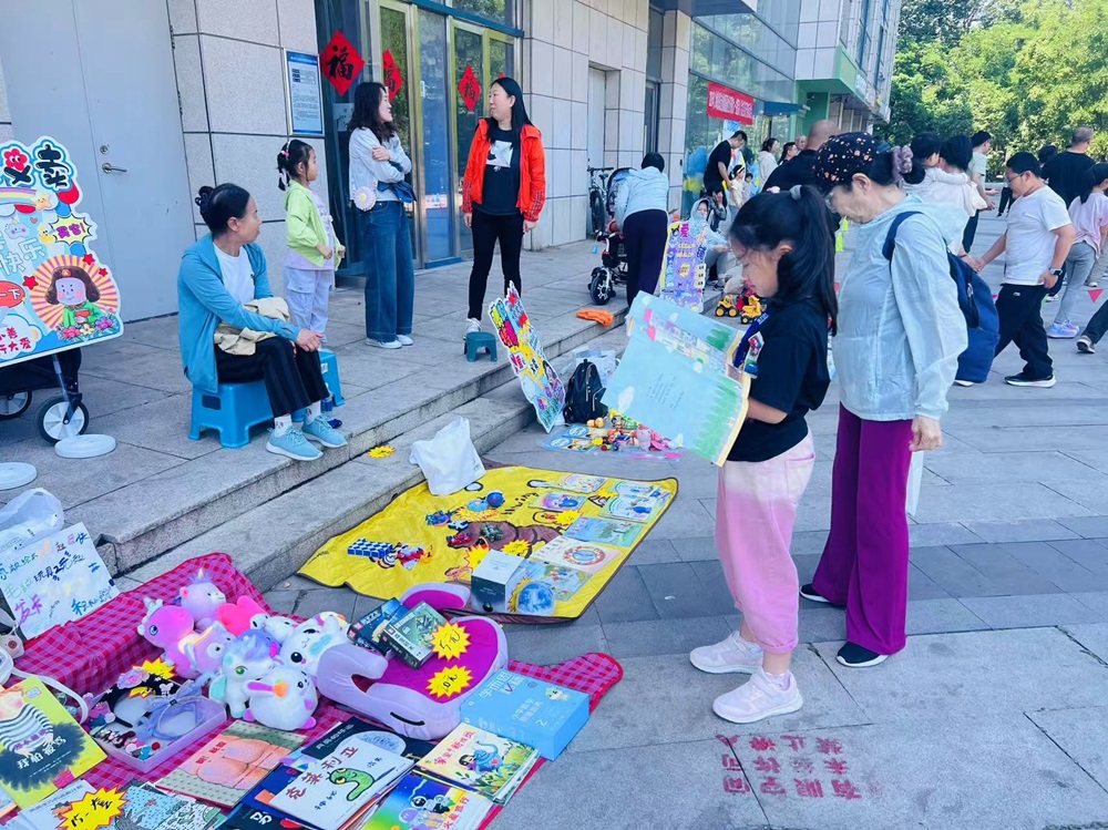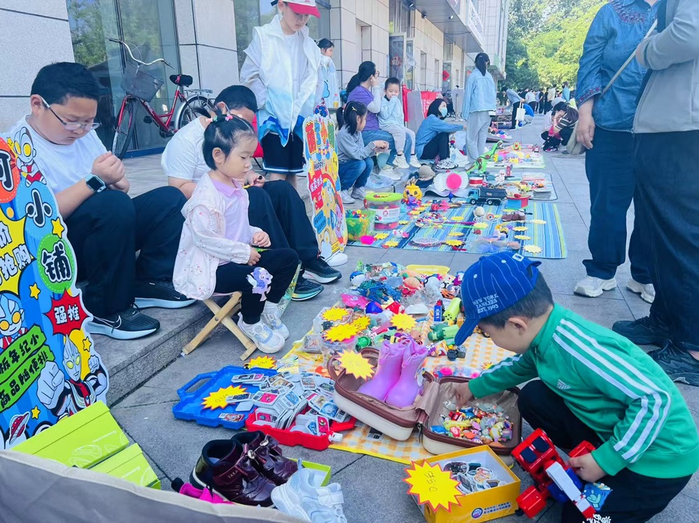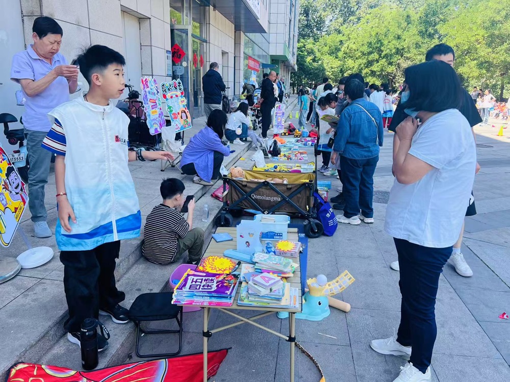 市集上,儿童玩具、书籍、手工制品等商品琳琅满目,家长和孩子们精心布置摊位,热情地向来往居民介绍自己的物品。身为“摊主”的孩子们用稚嫩却自信的声音大声吆喝,与前来挑选的小伙伴讨价还价。还有小志愿者们身着统一马甲,穿梭于摊位之间,协助维持秩序、引导人流,成为现场一道亮丽的风景线。