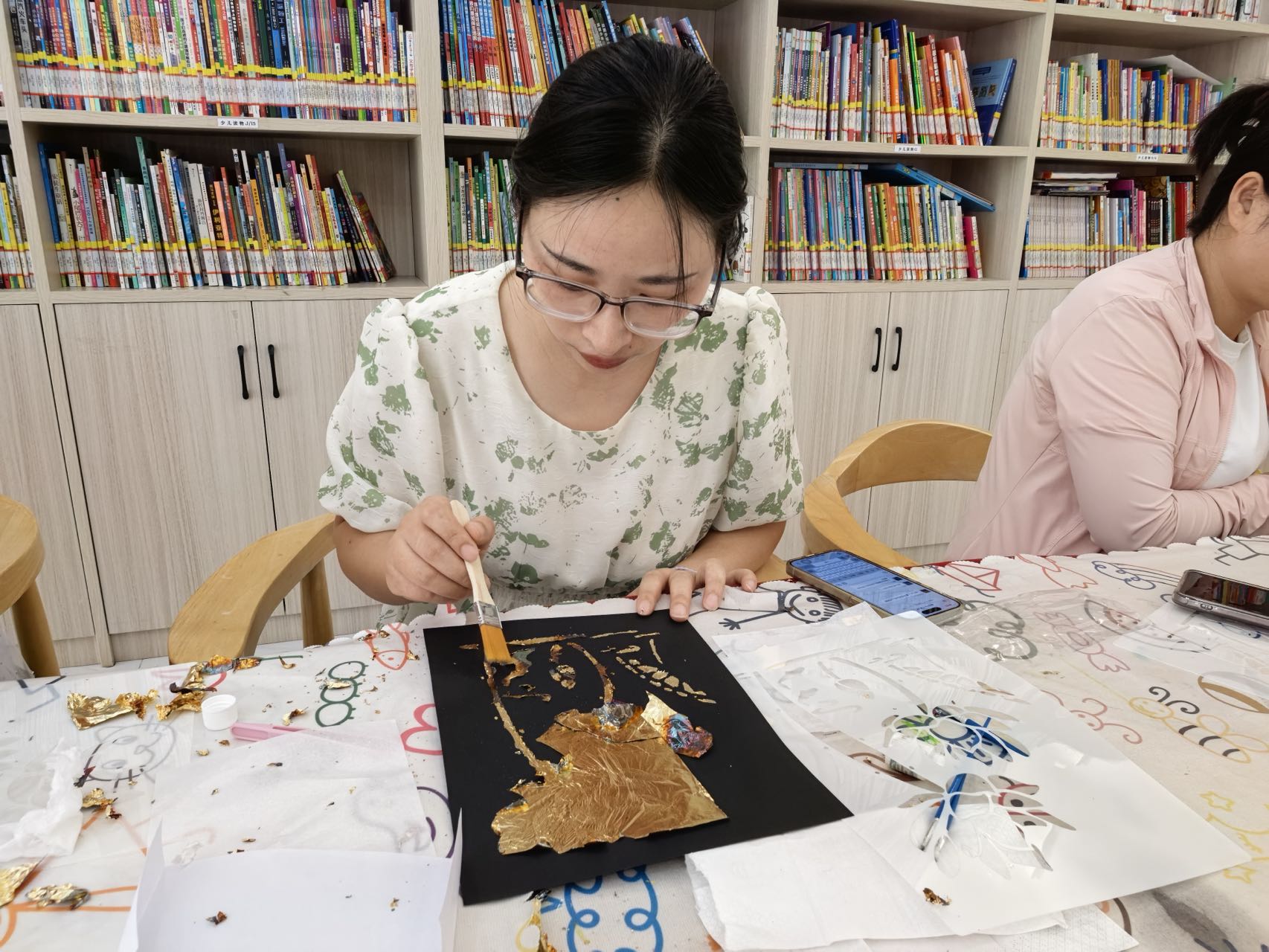 活动中,老师为大家介绍烧箔画的历史渊源以及工艺原理。随后,在老师的指导下,居民们认真地投入在烧箔画的制作中,经过裁烧金箔片、勾勒图案、涂抹黏合剂等基础工序,一幅幅精致典雅的烧箔画很快就制作好了。