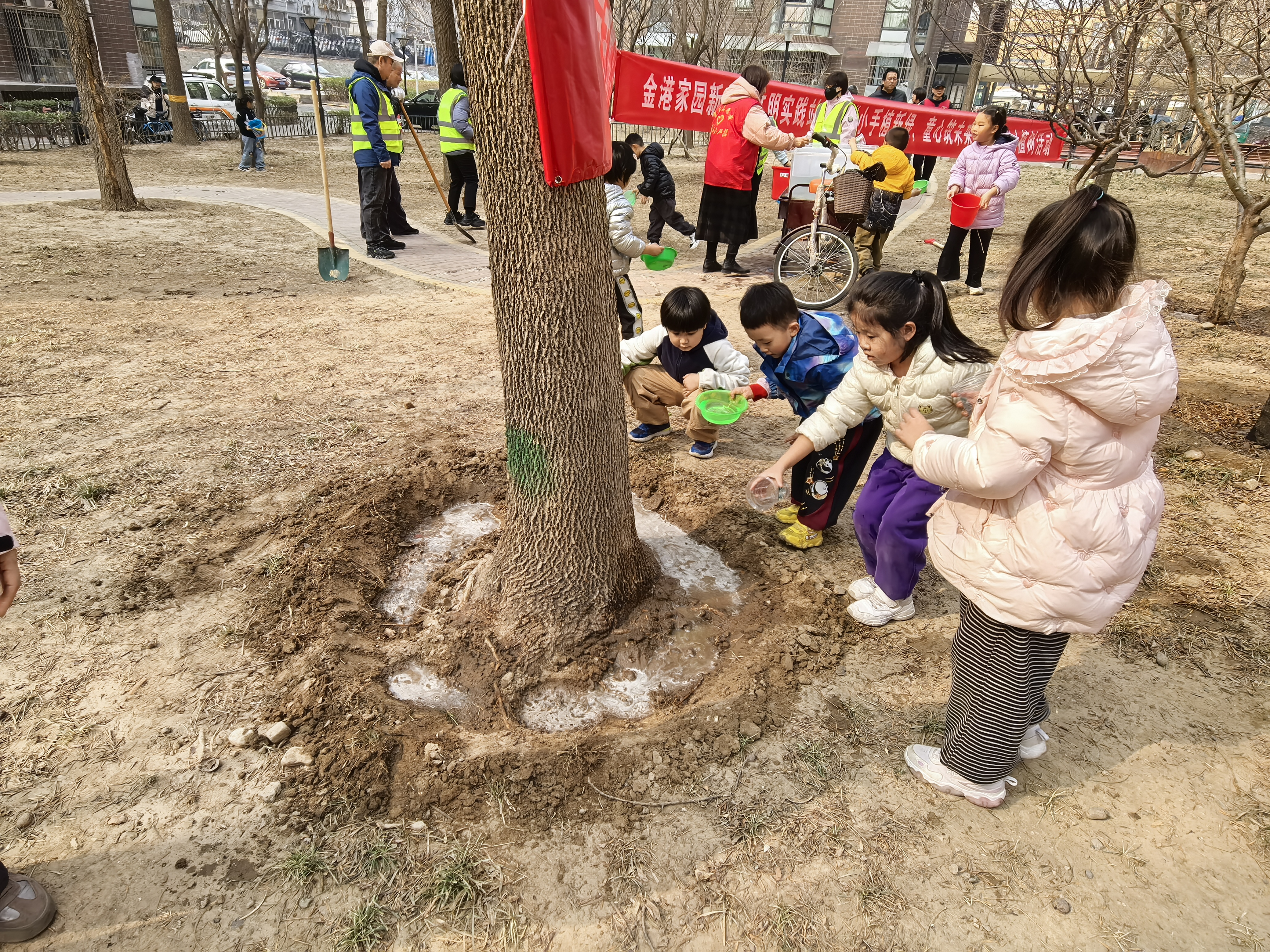 金港家园社区新时代文明实践站开展“小手植新绿 童心筑未来”未成年人植树活动