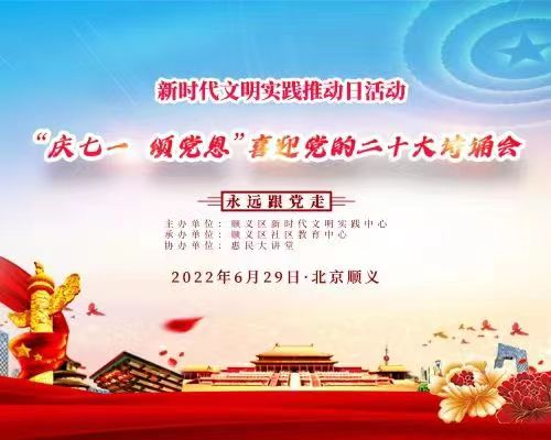 为纪念中国共产党成立101周年,6月29日,顺义区新时代文明实践中心举办“‘庆七一 颂党恩’喜迎党的二十大线上诗歌朗诵会”新时代文明实践推动日活动。本次活动由区社区教育中心承办,临空惠民新时代文明实践基地协办,在线浏览观看7万余人次。