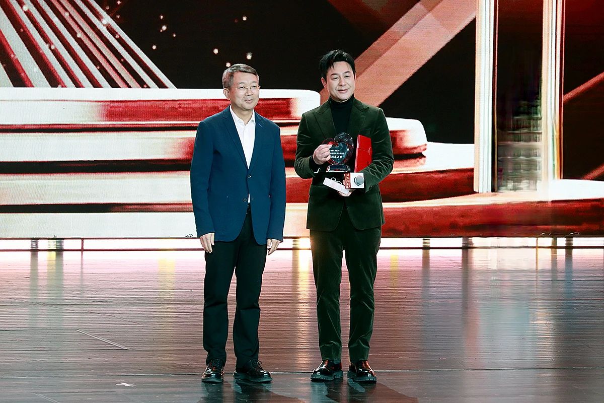顺义区委书记龚宗元为演员张颂文颁发顺义区志愿服务形象大使聘书。