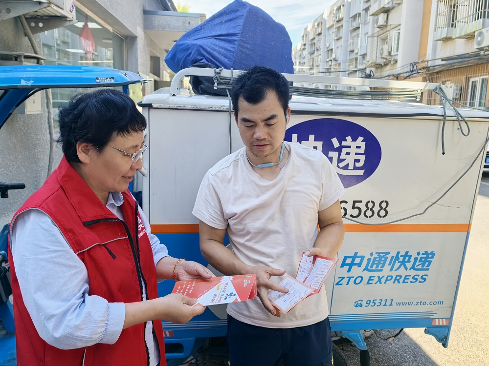 活动中,志愿者为快递小哥、外卖员送上顺义区社会工作部精心推出的“暖心服务”地图,说明地图上的服务驿站可以提供热水、打气筒、创可贴、卫生间、手机充电宝等服务,并提醒注意交通安全、送上健康关怀等慰问服务。