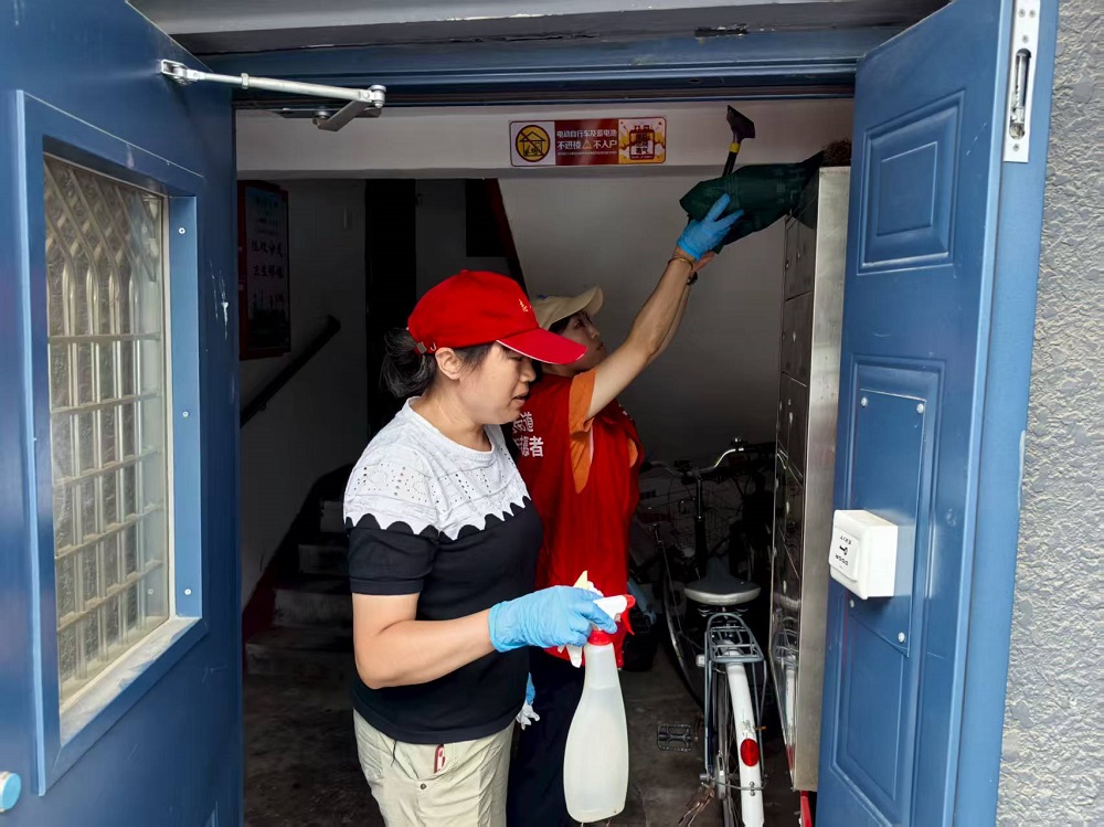 活动中,各群体分工协作、热情高涨。志愿者们手持小铲子、垃圾袋,逐栋清理楼道内的小广告与堆积杂物,细致铲除顽固贴纸,擦拭宣传栏,搬运废弃纸箱,让原本拥挤的楼道恢复畅通整洁,消除消防隐患;同时,检查楼道灭火器压力是否正常、保险销是否完好,确保消防设施“拿得出、用得上”。降雨过后,党员带头排查社区低洼路段、单元门口积水情况,居民与大学生们默契配合,有的用扫帚清扫积水,有的清理雨水箅子的落叶、杂物,快速疏通排水通道,避免积水影响居民出行。大家不怕脏、不怕累,忙碌的身影成为社区暑期里最温暖的风景线。