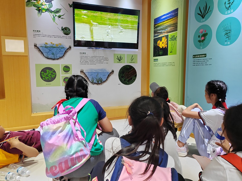 下午,大家走进汉石桥湿地自然保护区。志愿者芦苇姐姐讲解了汉石桥湿地自然保护区的发展历程、湿地常见动植物的特征等知识。随后,同学们走进昆虫标本室和植物标本室,近距离观察各类昆虫、植物标本,探秘不同物种的特征、习性等。