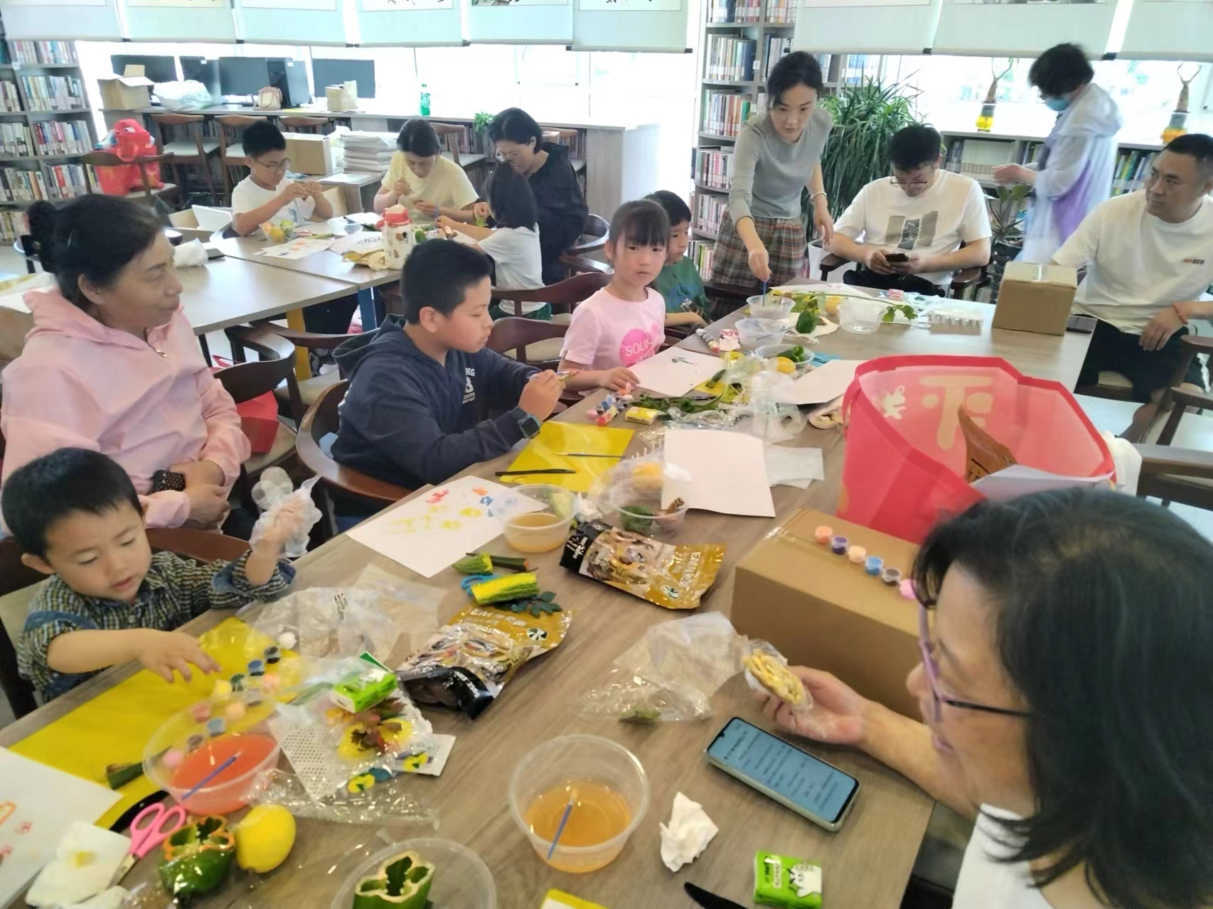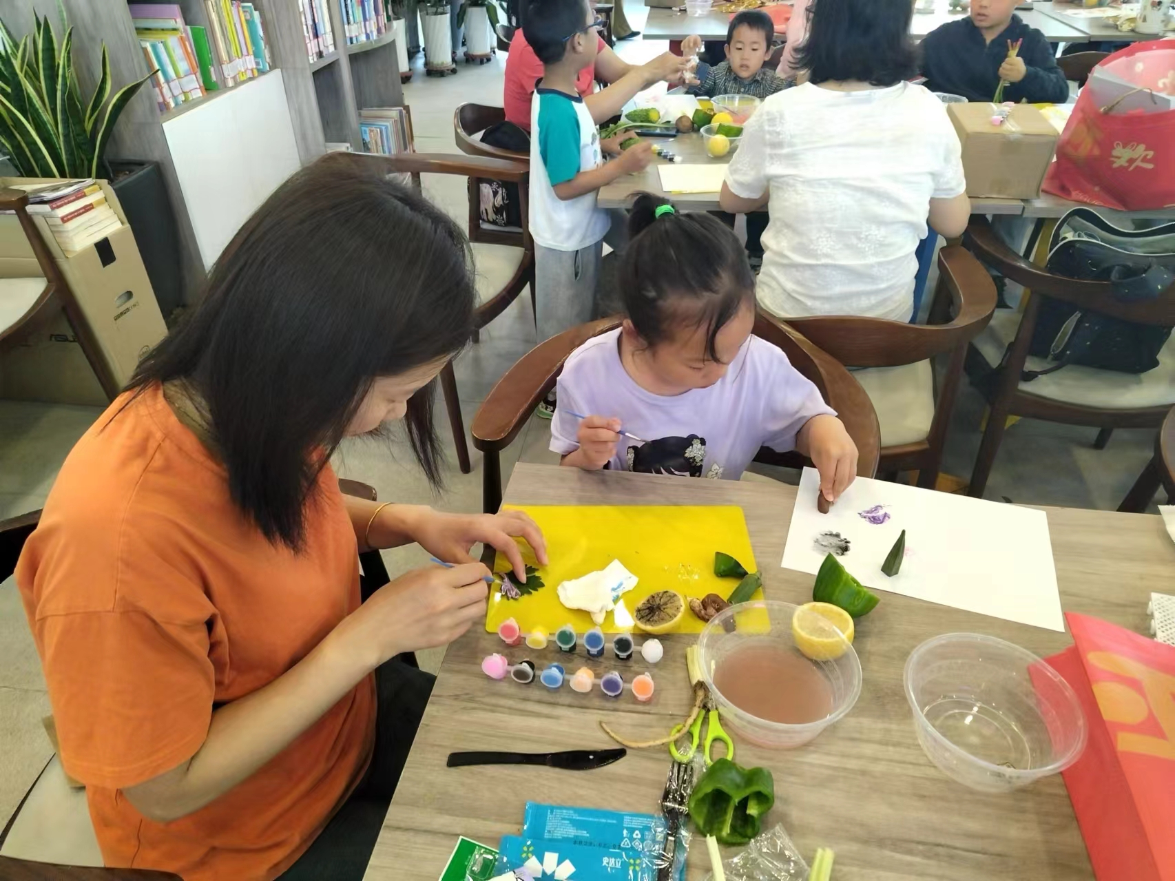 绘本阅读结束后,孩子们和家长一起制作了拓印手工画。孩子们兴致勃勃地一边浸泡厨房剩余的芹菜叶、菠菜根、青椒或香菇,一边敲打、用颜料固色,然后将蔬菜叶、根的纹路拓印到白纸上,不一会儿,一幅幅独具特色又充满自然气息的手工画作就制作好了,鲜艳明亮的颜色让孩子们十分喜爱。