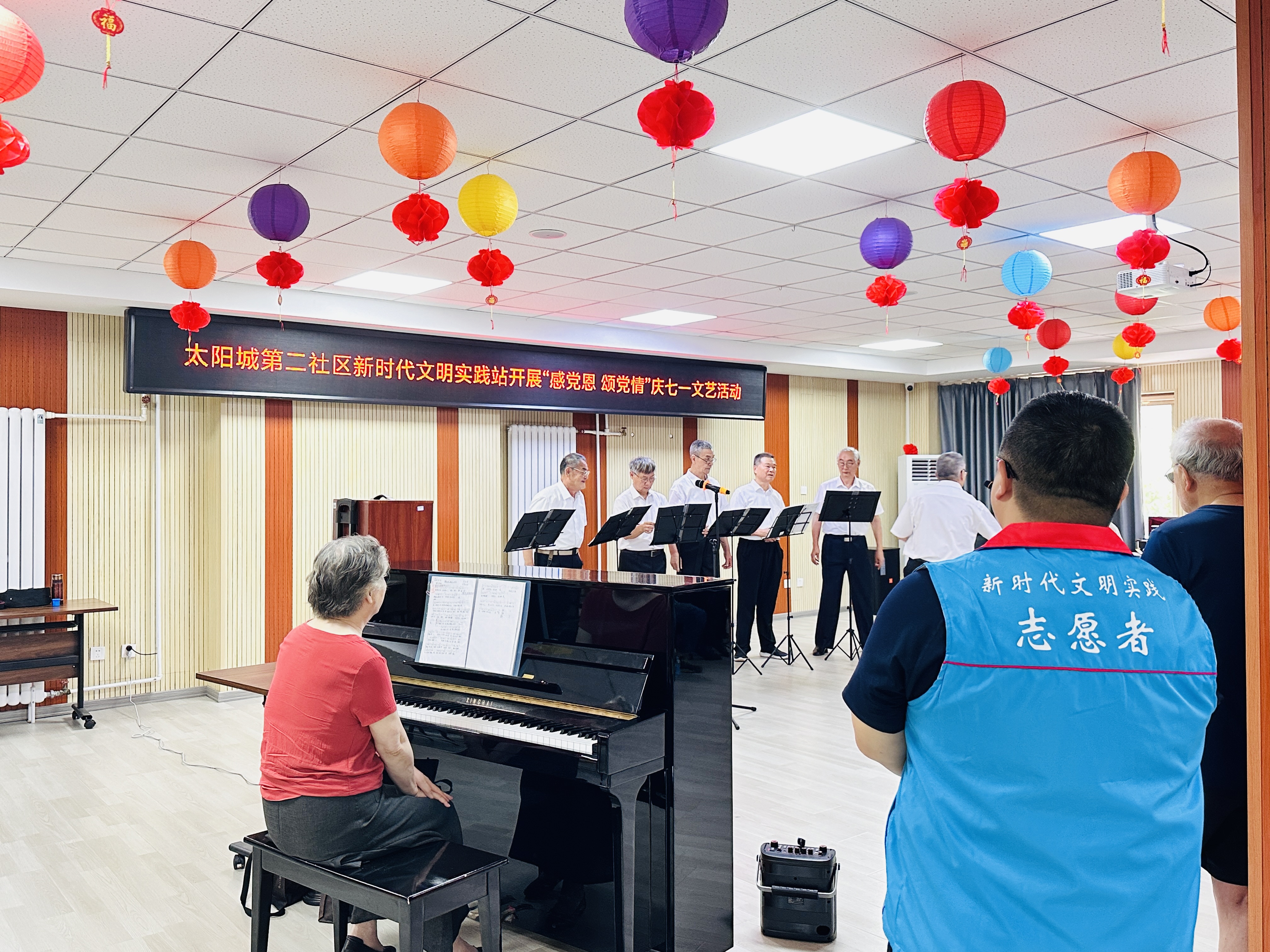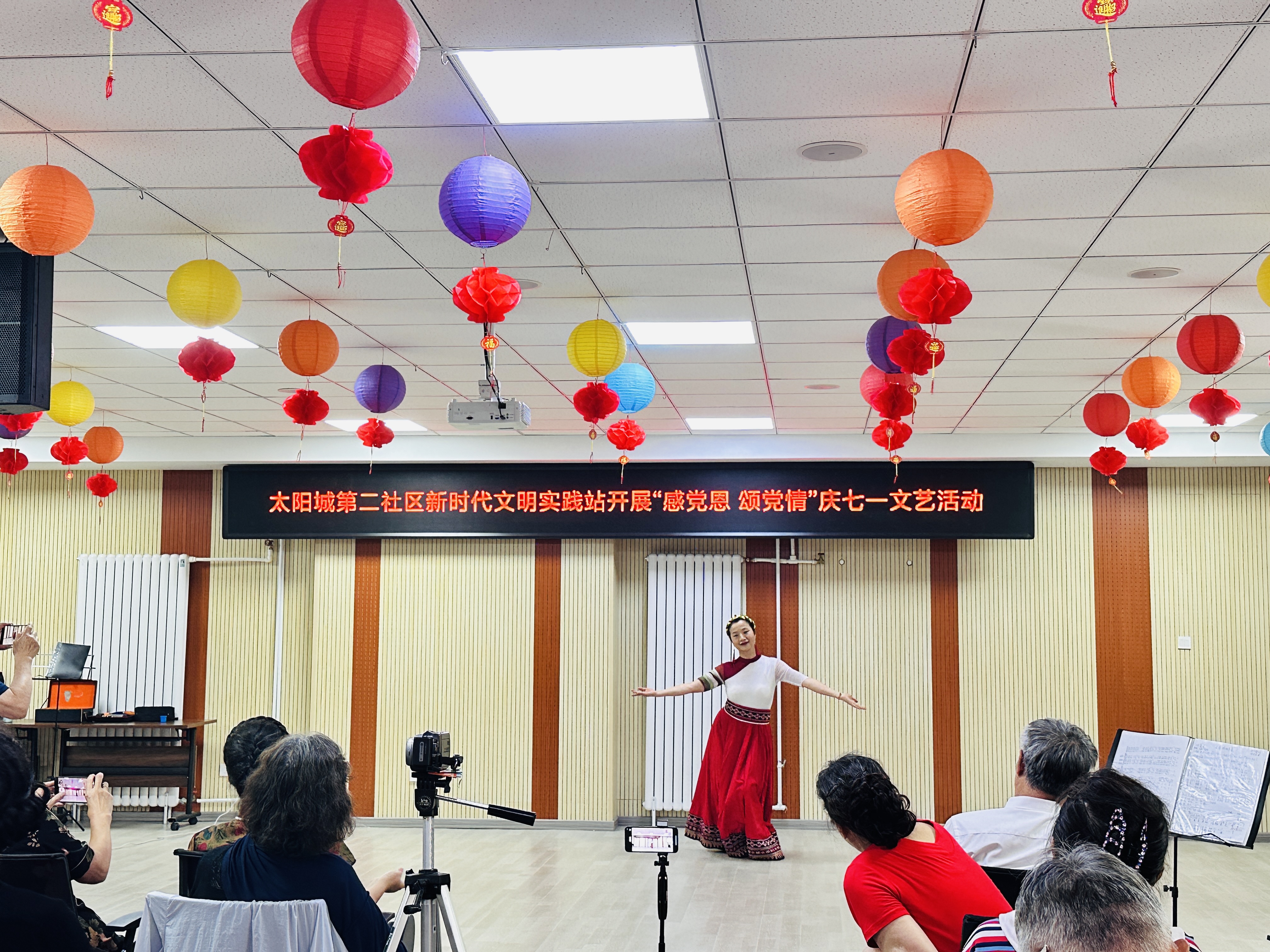 为庆祝七一建党103周年,太阳城第二社区新时代文明实践站组织社区文艺爱好者开展了“感党恩,颂党情”文艺活动,近50余位社区居民参加。